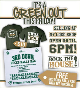 By the way, tonight is a "green out," and up until 6pm, our friends at My Logo Shop have a sale on playoff Tshirts. Snag a free third down rally rag with purchase. Might as well pick one up on the way to the game, right? Check it out: